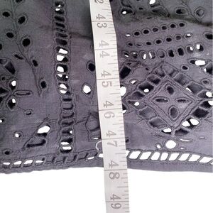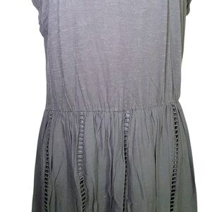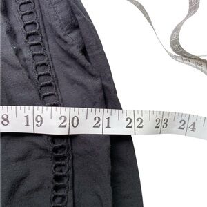 This dress is a sleeveless black midi dress featuring a round neckline and a relaxed, slightly gathered waistline that creates a flattering silhouette. The skirt is adorned with vertical ladder lace trim and delicate eyelet embroidery near the hem, adding texture and a subtle decorative touch. The hemline has a scalloped finish, enhancing its feminine and breezy style. The overall look is casual yet refined, making it suitable for both daytime outings and relaxed evening events.