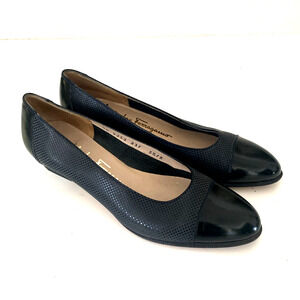 Salvatore Ferragamo Pump Black Textured Leather Almond Cap Toe Block Heel 5.5 B