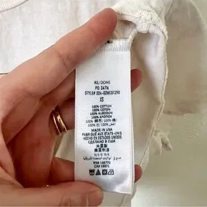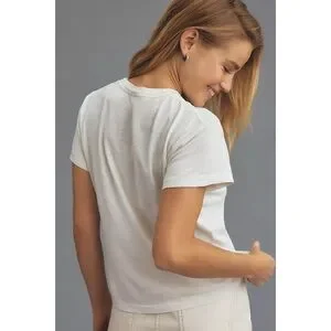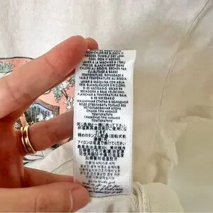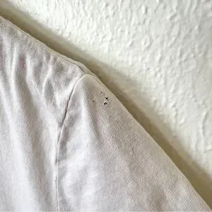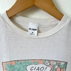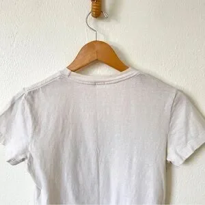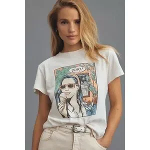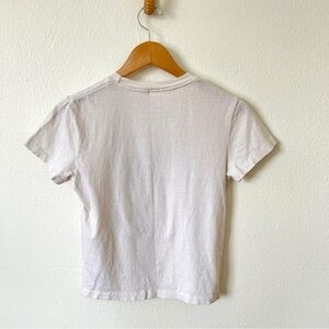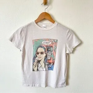 Soft cotton tee with comic style graphic on front. Lightweight jersey in a cream color. There are some tiny holes on one of the shoulders (pictured). Otherwise in great used condition!