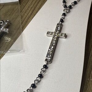 Silver Toe/Anklet with Rhinestone Cross & Black Beads