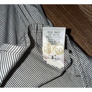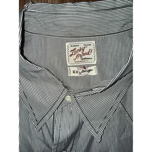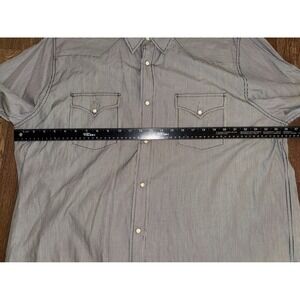 Keywords: Lucky Brand, western shirt, pinstripe, denim shirt, button down, long sleeve, XX large, pearl snaps, contrast stitching, casual wear, ranch style, classic fit, striped shirt, workwear