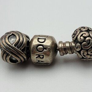 Pandora Brown Woven Leather Bracelet 6" With 3 Sterling Silver Charms All Marked