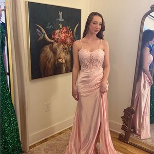 Elegant pink prom dress by Sherri Hill. Features delicate spaghetti straps and intricate bodice detailing. Perfect for a glamorous evening.