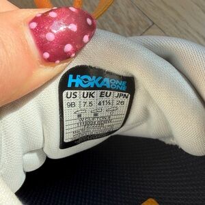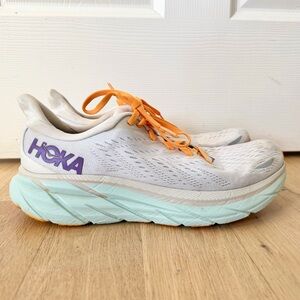 Hoka Clifton 8 athletic shoes. White base color with orange laces and mint green base. Women’s size 9. Overall good lightly used condition (wear on soles, slight discoloration). They have been washed!