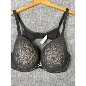 Cacique by Lane Bryant 42B black lace underwire bra. Beautiful floral lace overlay on the cups with a small bow accent. Lightly lined, supportive, and comfortable for everyday wear. Adjustable straps for a customized fit and hook-and-eye back closure.