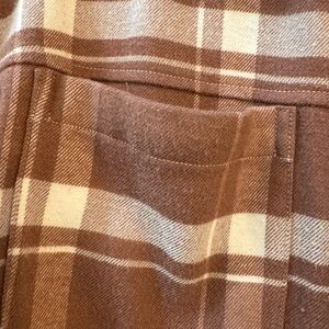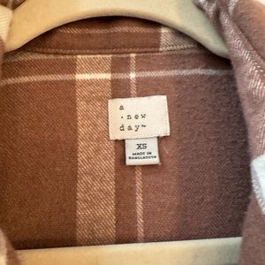 Chic tan plaid shirt jacket. Features button-up design and chest pockets.