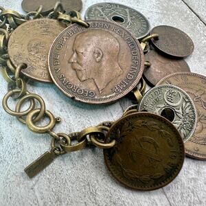 Genuine international currancies include 1919 George V British penny (bronze, Britannia seated) and Ottoman 29 para pieces with crescent moons, evoking eccentric wanderlust. Goldtoned chain with brass fittings, 7.5” length plus extender. Patinaed wear adds authentic allure. Mid-century origin (circa 1960s). Minor verdigris on select coins. Signed with Monet Jewelers hang tag located near clasp. Fourteen coin charms included.