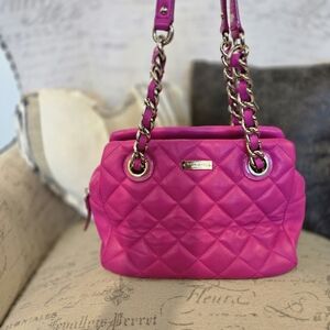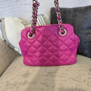 Stylish and vibrant pink quilted shoulder bag with elegant chain straps. Perfect for adding a pop of color to any outfit.