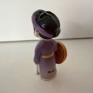 Pair of ceramic figurines in traditional attire. Features purple, green, and brown colors.