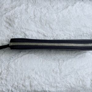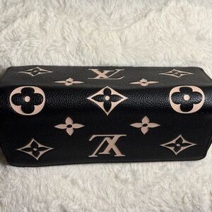 Currently unavailable in store or online, Limited Edition Authentic full leather wallet in Black with cream monogram and gold coated Sleek zipper closure.