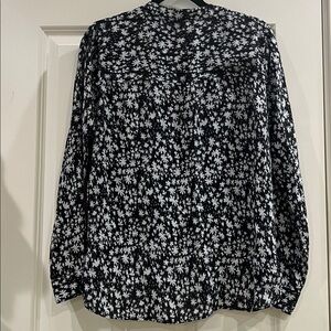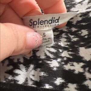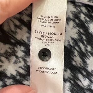 Black and white print blouse made by Splendid in great condition. Features a draped front which snaps closed at the chest, and asymmetrical design which is longer in the back. Long sleeve, casual design which can easily be dressed up for the office. Very soft fabric is 100% viscose.