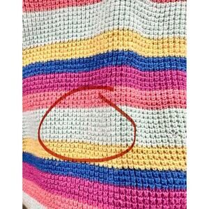 The BP Women's Pullover Sweater oversized in Medium features a colorful multicolor stripe pattern with long sleeves and a U-neckline. Made from a blend of 50% polyester, 35% viscose, and 15% nylon, this lightweight sweater is perfect for casual occasions and travel. The knit fabric adds texture and warmth to the boxy fit, making it a versatile piece for all seasons. Machine wash cold for easy care, this sweater is a vibrant addition to any woman's wardrobe.