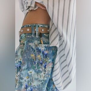 Features: Button fly closure, five-pocket design, screenprinted paint design