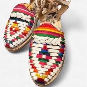 Embrace traditional Mexican craftsmanship with these beautiful, 100% handmade huarache sandals. These "huaraches de cinta" feature a vibrant, multi-colored woven upper and genuine leather straps designed to wrap gracefully around the ankle.
