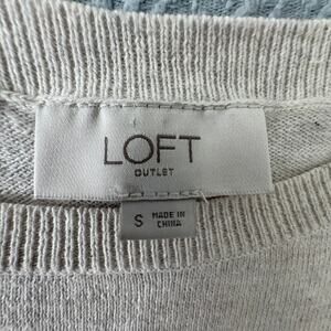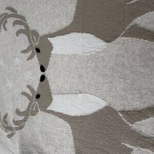 Cozy LOFT Outlet winter sweater featuring two mirrored reindeer in soft neutral tones with embroidered snowflakes. Women’s size Small. 100% cotton knit with long sleeves, ribbed trim, and a comfortable easy fit. Perfect for holiday gatherings, winter photos, or festive casual wear.