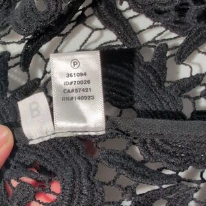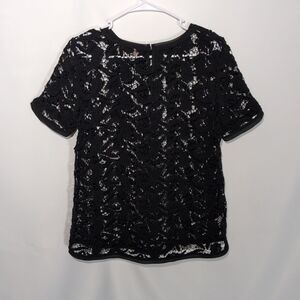 Chic black lace blouse. Features intricate lace design. Perfect for layering.