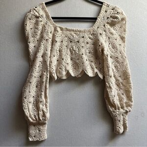 Zara Cream Crochet Women's Long Sleeve Top Sz S This cream blouse from Zara features charming puff sleeves and an embellished design, perfect for adding a touch of elegance to your outfit. The cropped style and intricate detailing make it a standout piece for any occasion.