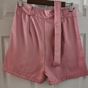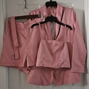 Pink 3-piece suit-set. Lined blazer with a single front button; cropped top with adjustable spaghetti straps; and high waisted shorts with two open side pockets, front zipper/buttonclosure, and optional tie belt. Smooth to the touch, lightweight and cool fabric made from 65% cotton and 35% polyester material. Excellent condition🌻