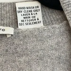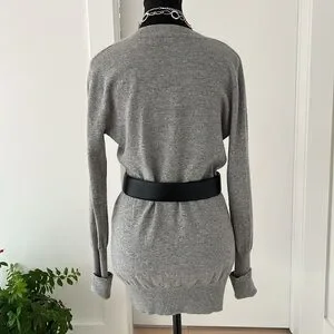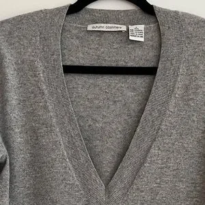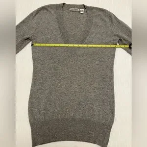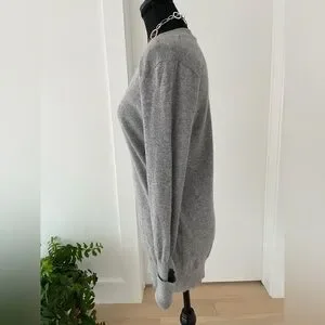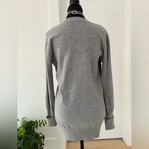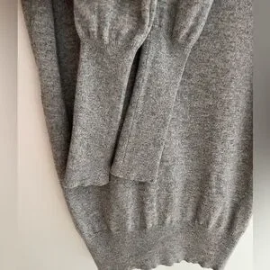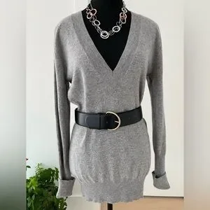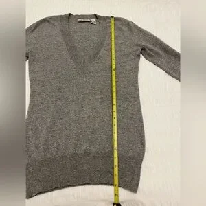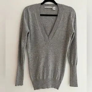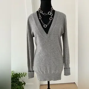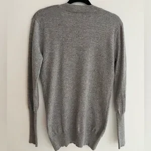 Autumn Cashmere grey pullover sweater has a deep V neck, and long ribbed cuffs. The cuffs can be rolled up for a customized length. Ribbing around the bottom and neckline as well. This sweater fits close to the body and is a longer length. 100% cashmere.
