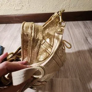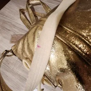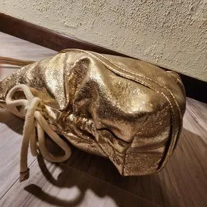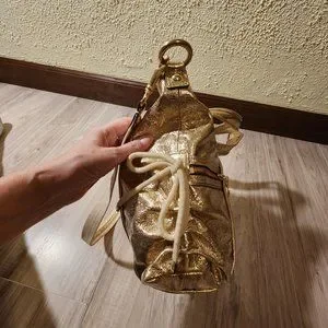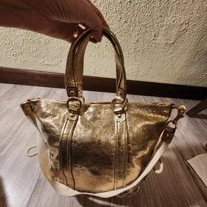 Elegant gold shoulder bag. Features dual handles and front zip pockets. Perfect for any occasion.