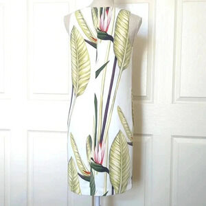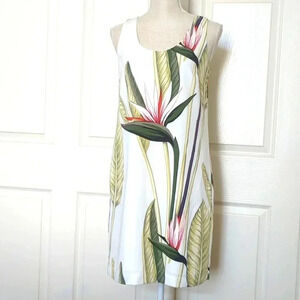 Ann Taylor Tropical Bird of Paradise Floral sleeveless Dress. White base with floral print.