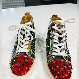 Christian Louboutin Rare Unisex Louis Flat Rainbow Python High Top sneakers in a multi-color studded design.