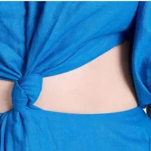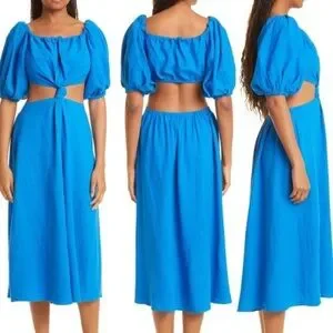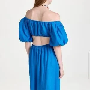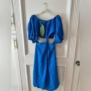 FARM Rio Blue Off-Shoulder Linen Midi Knot Dress Cutout Size L NWT