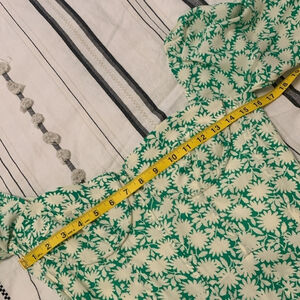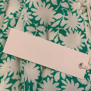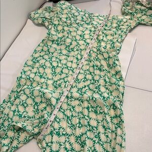 CAPULET Manzanita jumpsuit, with a fitted boned bodice with an underwire at the cups, back zipper, with hook and eye, cropped dramatic sleeve and wide leg, partially lined, floral green and white size medium. Capulet is sold at Revolve and Anthropologie
