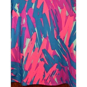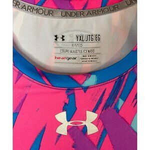 UNDER ARMOUR ~ Heat Gear performance fitted tee. UPF 30+. Youth XL. 80's abstract splash design. Multicolor: Hot pink, purple, cobalt, teal. Scoop neck and short sleeves. Style #1237859.