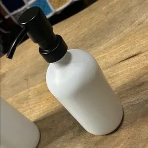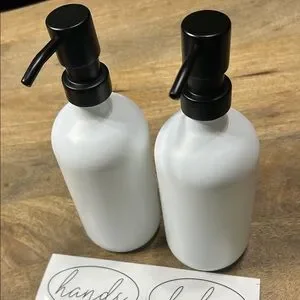 Upgrade your home decor with this elegant white soap dispenser set featuring sleek black pumps. Perfect for adding a modern touch to your kitchen or bathroom.