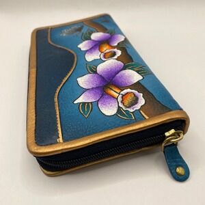 Magnifique Hand Painted Flower Zip Around Wallet Teal Blue Purple Leather NWT