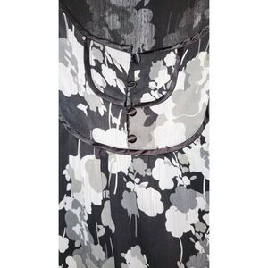 Captivating floral artistry adorns this sheer black top, drawing the eye with its delicate dance of white and grey blossoms. A flattering scoop neckline is beautifully framed by contrasting dark trim and accented with three charming buttons, adding a touch of refined detail. The short, fluttery sleeves offer a breezy feel.