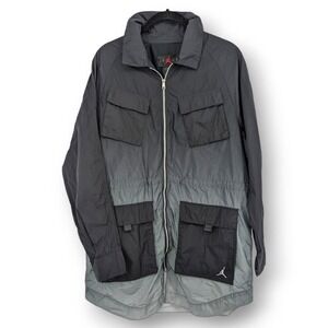 Elevate your streetwear with this authentic Jordan 23 Engineered Woven Jacket, a technical utility piece originally released in the brand's premium collection. This long, utilitarian jacket features a unique black and grey ombre/gradient fade with a durable, water-repellent woven nylon shell. The design is highly functional with multiple oversized flap cargo pockets on the chest and lower body and a full-zip closure. The fit is intentionally relaxed and oversized, embracing the techwear and unisex aesthetic. It's built for layering and is perfect for anyone looking for a statement piece with superior form and function.