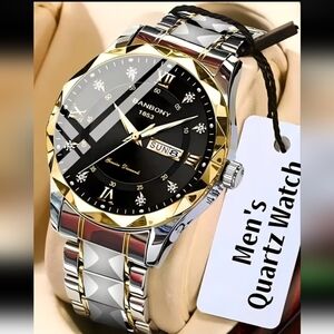1pc Mens Black and gold Luxury Stainless Steel Strap Multifunctional, Quartz Watch- Roman Numerals Dial, Rhinestones Accents, Luminous Hands, Water-Resistant. Perfect for any occasion.