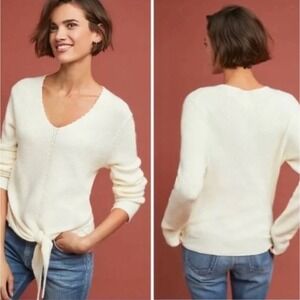 Anthropologie Freeport Sweater Ribbed Cream V-neck Front Tie Stretch