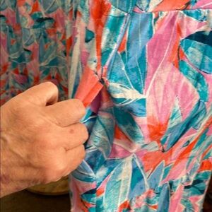 This sleeveless sundress features a vibrant blue and pink tropical print, perfect for resort wear. The scoop neckline and midi length offer a breezy, casual style ideal for warm weather. Crafted from light, airy fabric, it ensures comfort and elegance on sunny days.