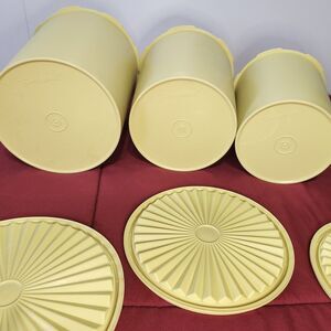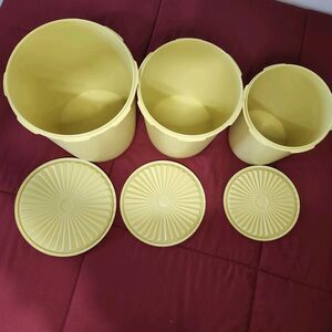 Vintage Tupperware Servalier canisters set of 3 Harvest Gold yellow daisy sunburst 1970s retro kitchen storage plastic airtight stackable