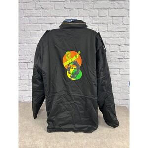 RARE Vintage Rothco Ultra Force military field jacket in black featuring a featuring a vibrant 'Dopeville' theme and graphic of Bob Marley. Designed for durability and functionality with multiple front flap pockets with button closures, a removable quilted liner, adjustable cuffs, and a drawstring waist for a customized fit. The collar has a concealed hood.