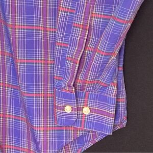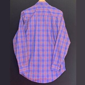 Fantastic men's dress shirt from Hickey Freeman. Attractive tartan plaid in a nice shade of purple. Nice concealed collar buttons. No flaws detected.
