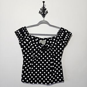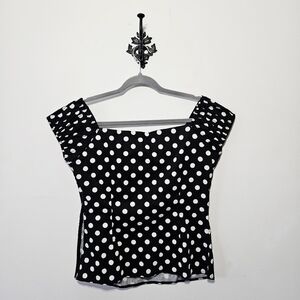 Chic black blouse with white polka dots. Features a flattering sweetheart neckline. Perfect for vintage-inspired looks.