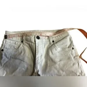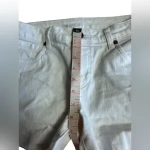 Keywords: cut-off shorts, white denim, women's shorts, casual wear, summer fashion, mid-rise, frayed hem, 5-pocket design, pre-owned.
