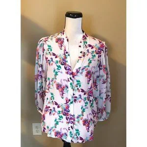 A vibrant floral enlivens this elegant silk blouse. Split V-neck. Gentle pleating at shoulders. Three-quarter length blouson sleeves with gathered cuffs. Concealed front button placket. In white/lavender/green with pops of orange and golden yellow. Concealed button front. Relaxed fit. Yoked back, shirttail hem. Great condition! No flaws or wear.