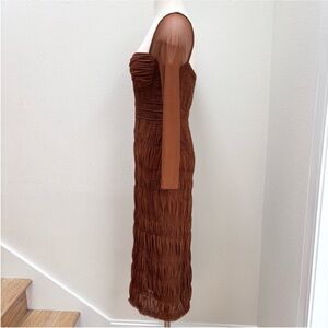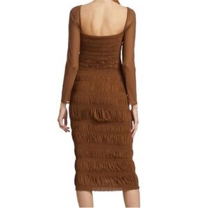 Self Portrait Midi Dress Shirred Mesh Long Sleeve Ruched Chocolate Brown Size 6