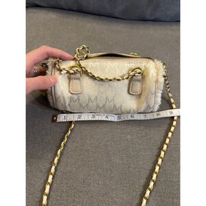 This unbranded mini bag features a beige fabric exterior with a subtle "M" monogram pattern and fringed ends. It has a gold-toned chain strap interwoven with white faux leather, adjustable shoulder strap. The bag closes with a top zipper, revealing a dark red fabric interior. Visible signs of wear include some fraying on the fringe and minor discoloration on the gold-toned hardware. The bag measures approximately 8 inches in length.