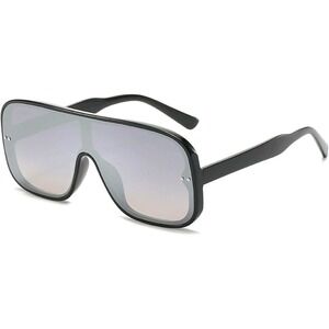 Sleek shield sunglasses, a bold statement piece for the modern man. These sunglasses feature an oversized, flat-top design with a mirrored lens that offers both style and sun protection. The solid black frame adds a touch of sophistication, while the visor shape provides ample coverage. Perfect for making a statement at outdoor events, music festivals, or simply adding an edge to your everyday look.