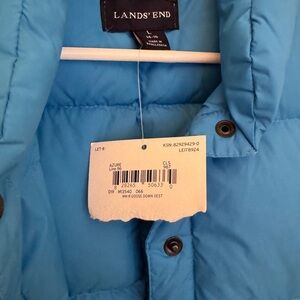 NWT Lands’ End women’s goose down vest in a bright blue color. Size large (14-16). Quilted sleeveless design with a snap-button front, cozy stand collar, and side pockets. Lightweight but warm—perfect for layering during fall and winter. All original tags are attached. Fast shipping!