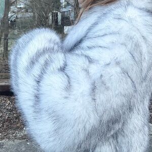 Ultra Thick Warm HIGH End Gradient Color Faux Fox Fur long Coat. Three Snap Button Closures. Black Thick upgraded lining. Size LADIES LARGE, 8-10. SEE SIZE CHART.