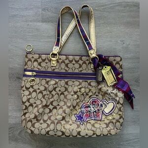 Elegant Coach shoulder bag with signature tan pattern. Gold accents and handles. Includes decorative scarf and charm.