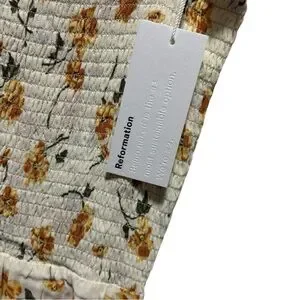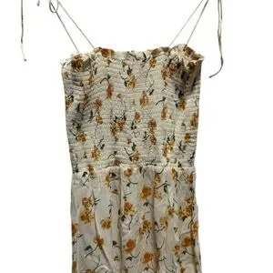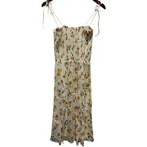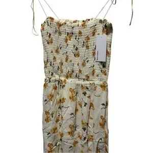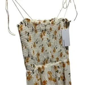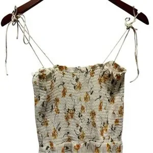 Features straight neckline, smocked bodice, and spaghetti tie straps