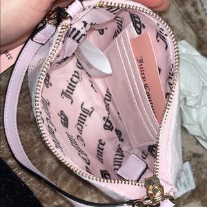 Elegant Juicy Couture shoulder bag in light pink. Features heart design with sparkling accents. Perfect for adding a touch of glamour.